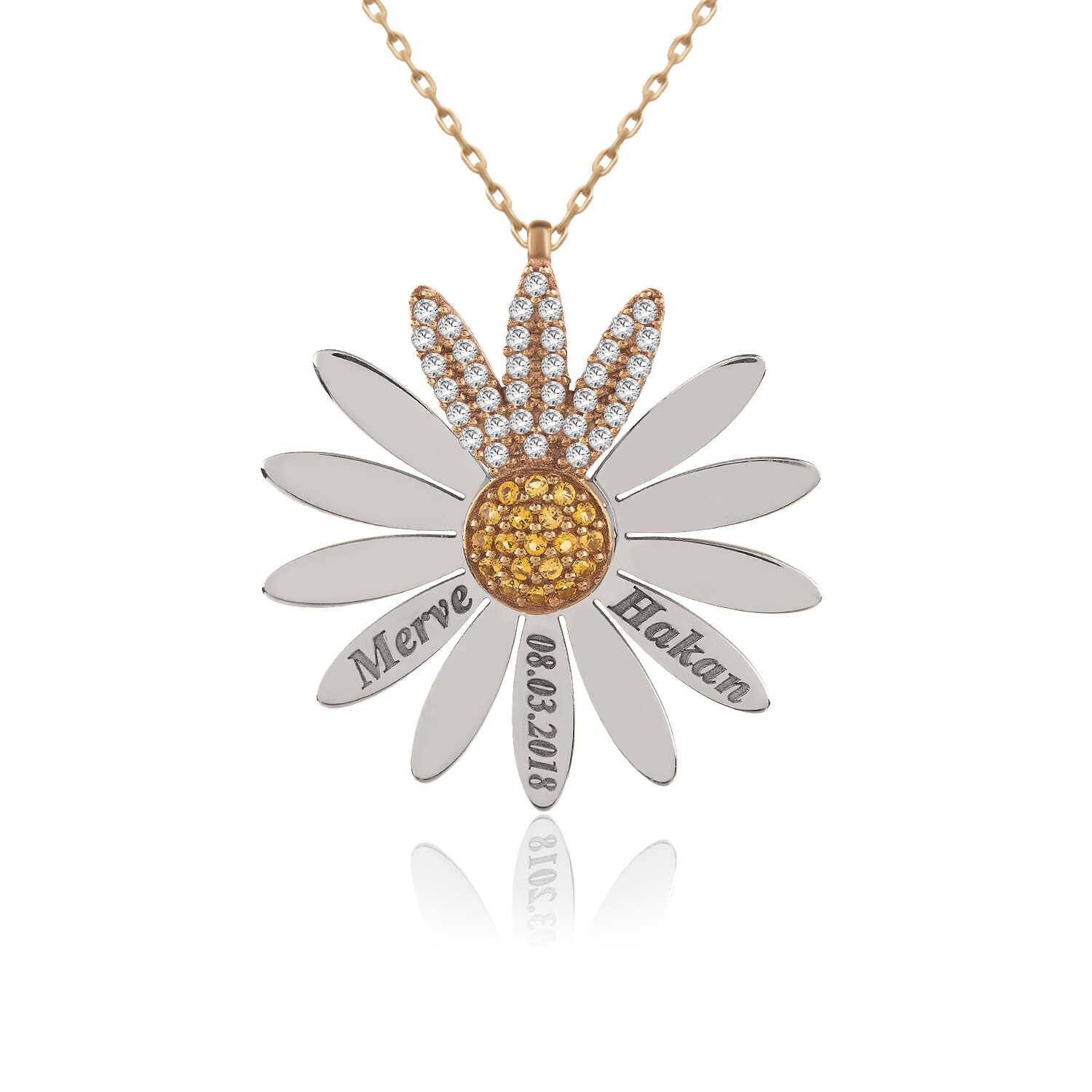 Papatya şeklinde tasarlanmış yaprakları üzerinde isteğe özel isim yazan ve şıklığınızı tamamlayacak bir gümüş kolye